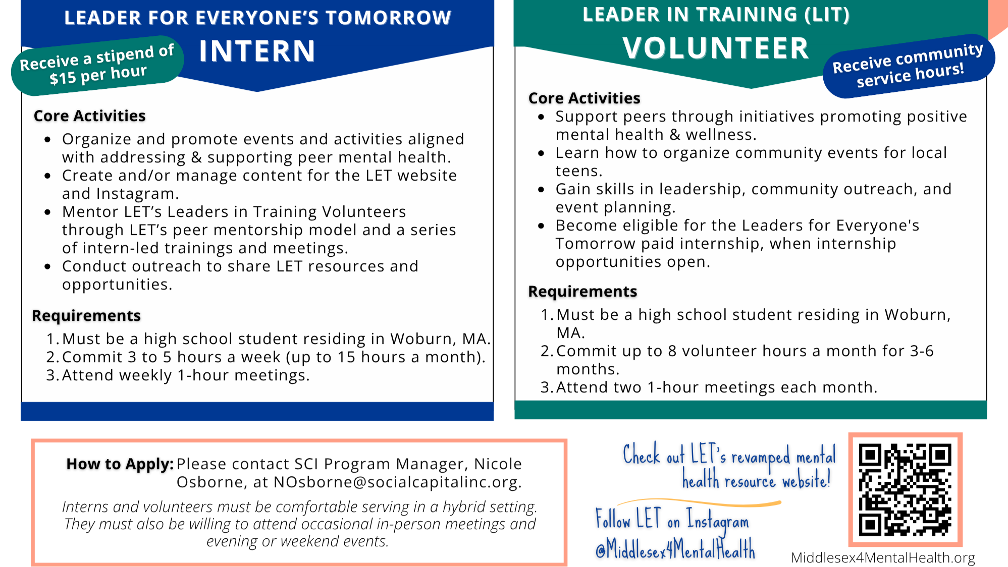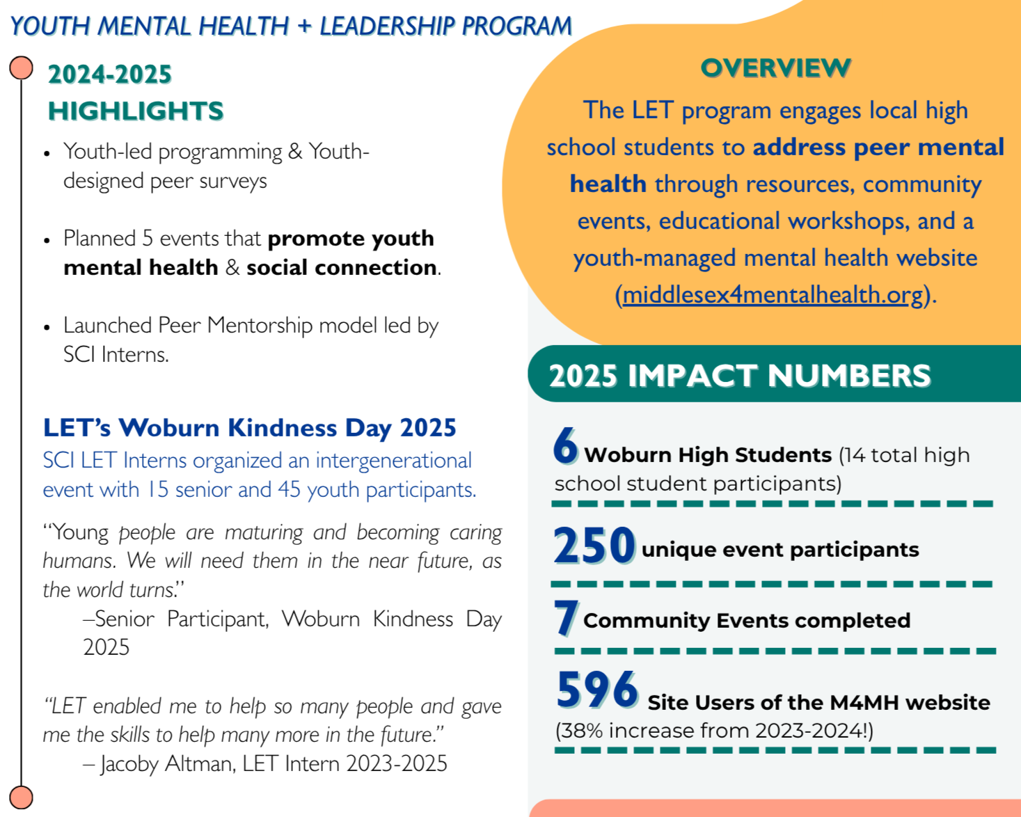 The LET Program engages local high school students to address peer mental health through resources, community events, educational workshops, and a youth-managed mental health website (middlesex4mentalhealth.org).