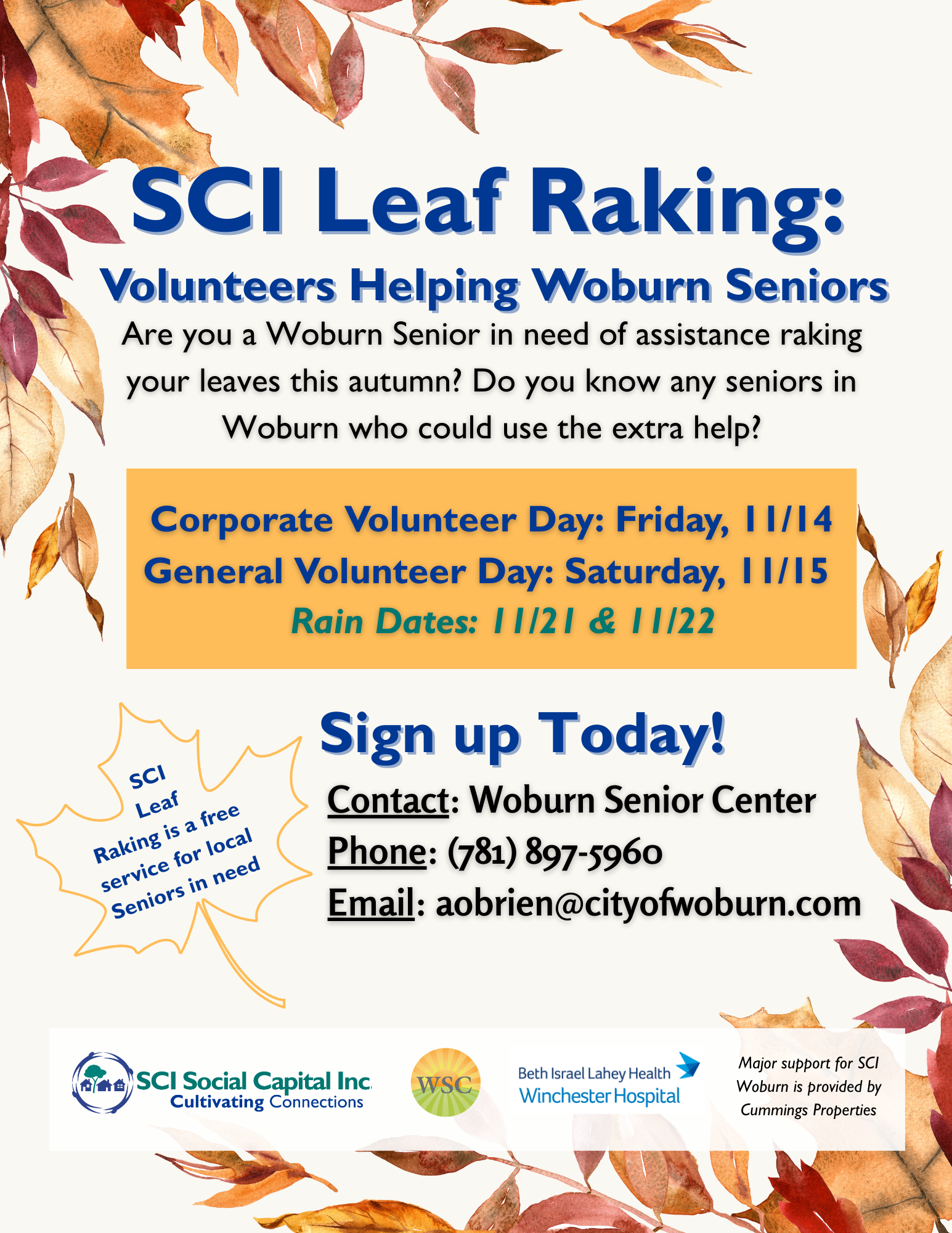 SCI’s annual leaf raking volunteer event provides free leaf removal assistance through community volunteers at the homes of Seniors in Woburn. This program is in partnership with Woburn Council on Aging and the Woburn Senior Center.